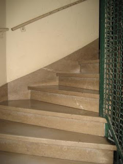 wake up between 11 and 2:30, have coffee and breakfast, and leave apartment going down these stairs (almost ate it on day 2, have walked down with more caution since)